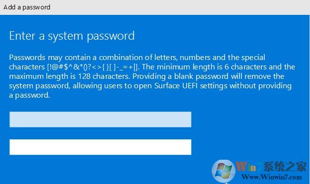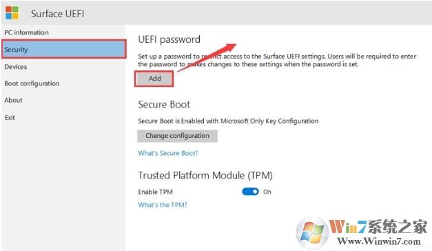 2、进入BIOS界面后,我们首先往下移到security(安全选项)上,在右侧的uefi password增加密码,在将 Surface 设备启动到 UEFI 时,必须输入此密码。 密码可包含以下字符:大写字母:A-Z 小写字母:a-z 特殊字符: ! @# $%^ & * () ? <>{}[]-_ = + |。,;: '"密码必须最少为 6 个字符,并且区分大小写,如下图所示;
