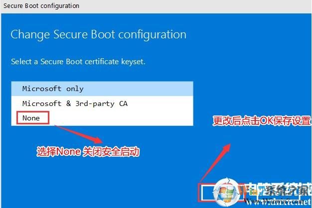 3、返回到security(安全选项)上,进入进入右侧的change configuration进入安全启动设置,然后将secure boot configuration改成noe关闭安全启动(安装WIN7系统一定要关闭),如下图所示;