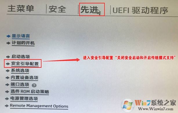 2、进入BIOS后,将移动键盘到“先进”选项下,选择"安全引导配置",按回车键进入设置;