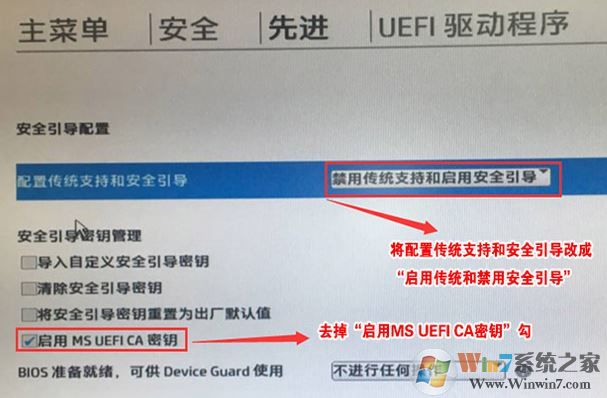 3、回车后,将配置传统支持和安全引导设置电脑“启用传统支持和禁用安全引导”以及去掉“启用MS UEFI CA密钥”前面的勾,然后按F10保存更改;