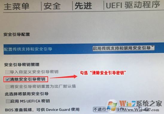 4、F10保存重启后再次开机按ESC,然后选择F10进入BIOS设置,将进入刚设置的地方,勾选“清除安全引导密钥”,然后再次F10保存;