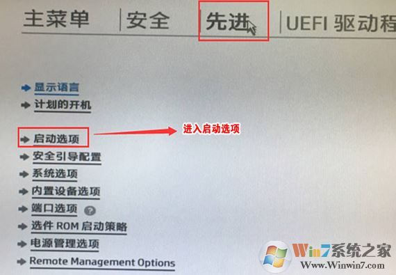 5、F10保存重启后再次开机按ESC,然后选择F10进入BIOS设置,将鼠标移动“先进”选项中,选择"启动选项"后回车进入,如下图所示;