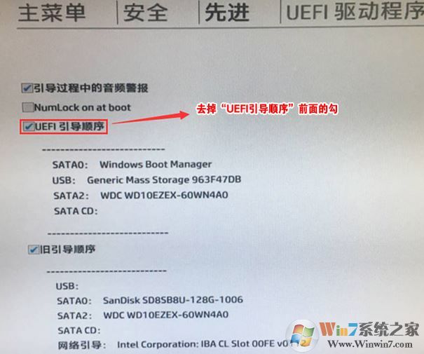 6、进入后将UEFI顺序前面的勾去掉,让机器默认为传统启动,这样方便安装WIN7,如下图所示;