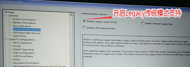 3、切换到Advanced Boot Options将右边的Enable legacy option roms选项打勾,如下图所示;