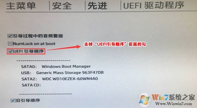 6、进入后将UEFI顺序前面的勾去掉,让机器默认为传统启动,这样方便安装WIN7,如下图所示;