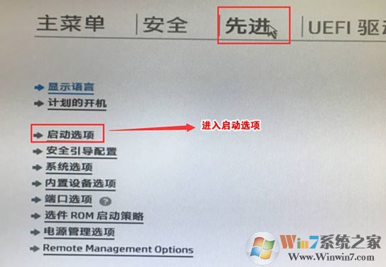 5、F10保存重启后再次开机按ESC,然后选择F10进入BIOS设置,将鼠标移动“先进”选项中,选择"启动选项"后回车进入,如下图所示;
