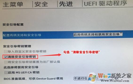 4、F10保存重启后再次开机按ESC,然后选择F10进入BIOS设置,将进入刚设置的地方,勾选“清除安全引导密钥”,然后再次F10保存;