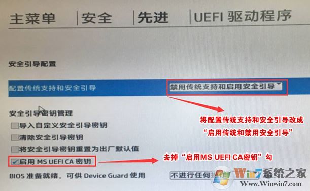 3、回车后,将配置传统支持和安全引导设置电脑“启用传统支持和禁用安全引导”以及去掉“启用MS UEFI CA密钥”前面的勾,然后按F10保存更改;