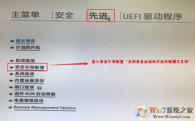 2、进入BIOS后,将移动键盘到“先进”选项下,选择"安全引导配置",按回车键进入设置;