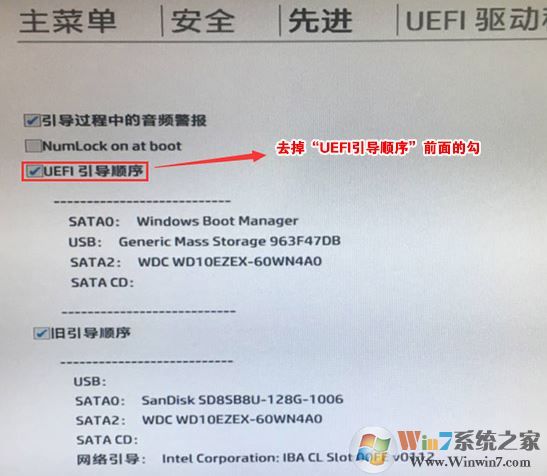 6、进入后将UEFI顺序前面的勾去掉,让机器默认为传统启动,这样方便安装WIN7,如图: