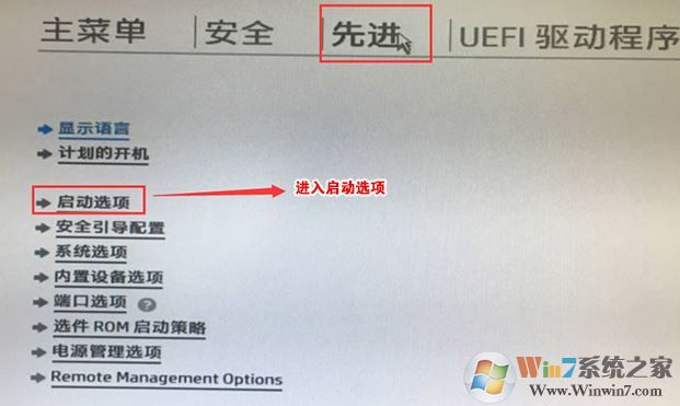 5、F10保存重启后再次开机按ESC,然后选择F10进入BIOS设置,将鼠标移动“先进”选项中,选择"启动选项"后回车进入,如图: