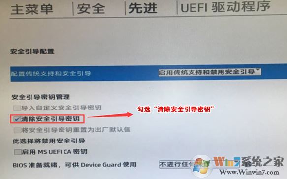 4、F10保存重启后再次开机按ESC,然后选择F10进入BIOS设置,将进入刚设置的地方,勾选“清除安全引导密钥”,然后再次F10保存,如图: