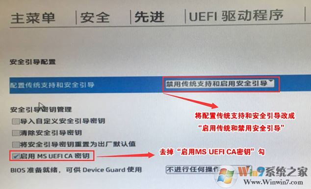 3、回车后,将配置传统支持和安全引导设置电脑“启用www.xiuchufang.com传统支持和禁用安全引导”以及去掉“启用MS UEFI CA密钥”前面的勾,然后按F10保存更改,如图: