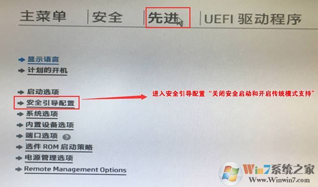 2、进入BIOS后,将移动键盘到“先进”选项下,选择"安全引导配置",按回车键进入设置,如图: