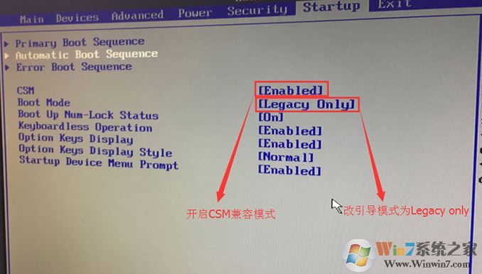 3、切换到Boot,把Boot Mode从UEFI改成Legacy only引导模式,再把csm默认disabled改成enabled,开启兼容模式,选择F10保存设置,在弹出的选项中选择YES;