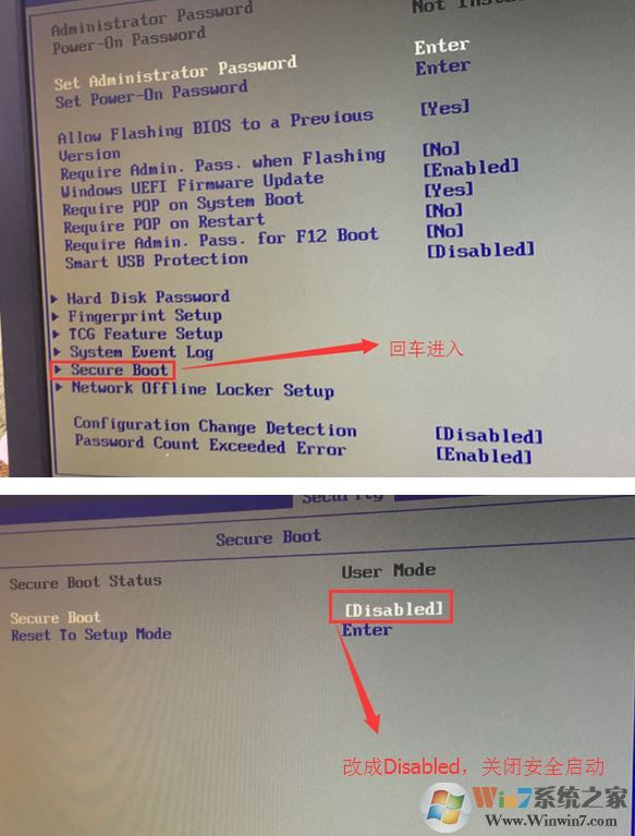 1、开机一直按F2或(FN+F2)进入BIOS,按→方向键切换到Security,选择Secure Boot回车设置成Disabled;