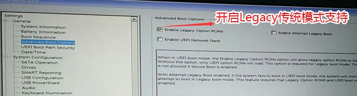3、切换到Advanced Boot Options将右边的Enable legacy option roms选项打勾,如下图所示;
