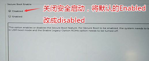 1、开机一直按F2进入BIOS,按F2进入BIOS界面,切换到secure BOOT页面,选择secure Boot Enable按回车改成Disabled,如图所示;