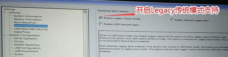 2、切换到Advanced Boot Options将右边的Enable legacy option roms选项打勾,如下图所示;