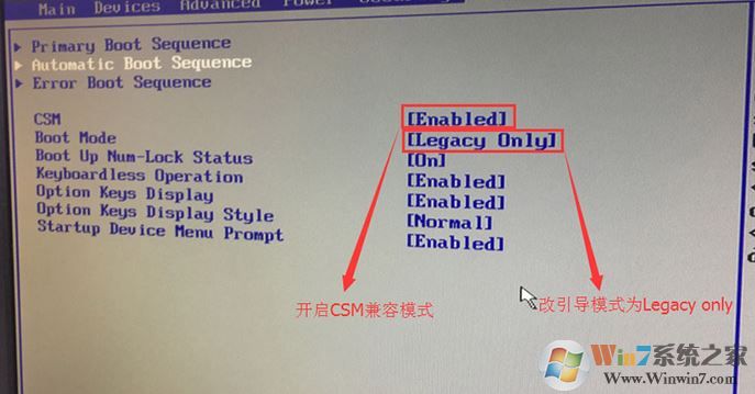 3、切换到Boot,把Boot Mode从UEFI改成Legacy only引导模式,再把csm默认disabled改成enabled,开启兼容模式,选择F10保存设置,在弹出的选项中选择YES;