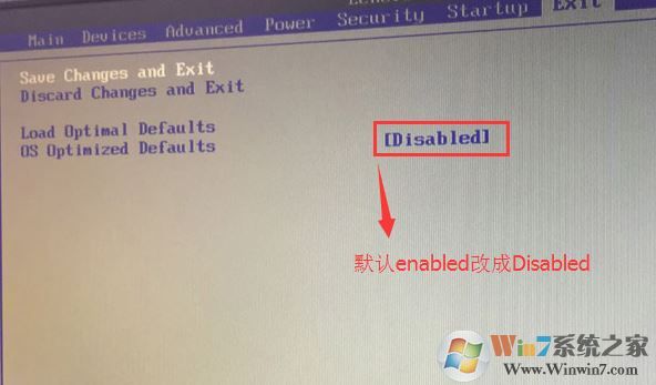 2、转到Exit,把OS Optimized Defaults设置为Disabled;