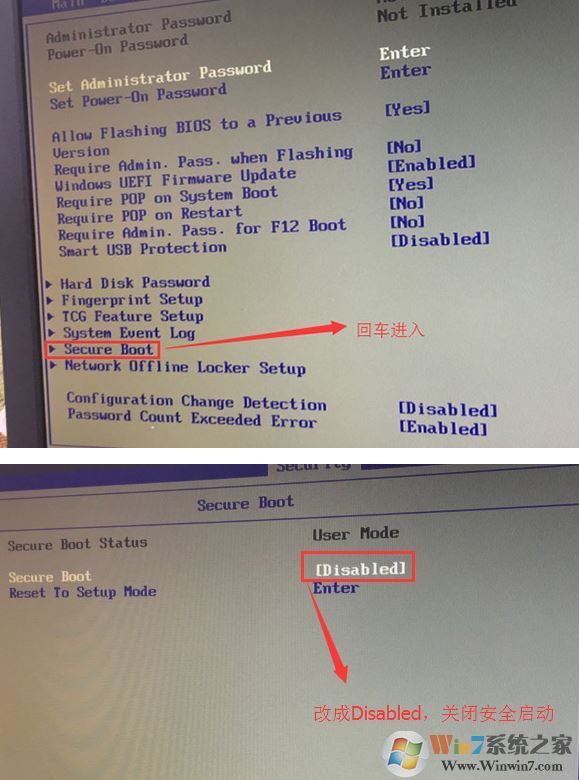1、开机一直按F2或(FN+F2)进入BIOS,按→方向键切换到Security,选择Secure Boot回车设置成Disabled;