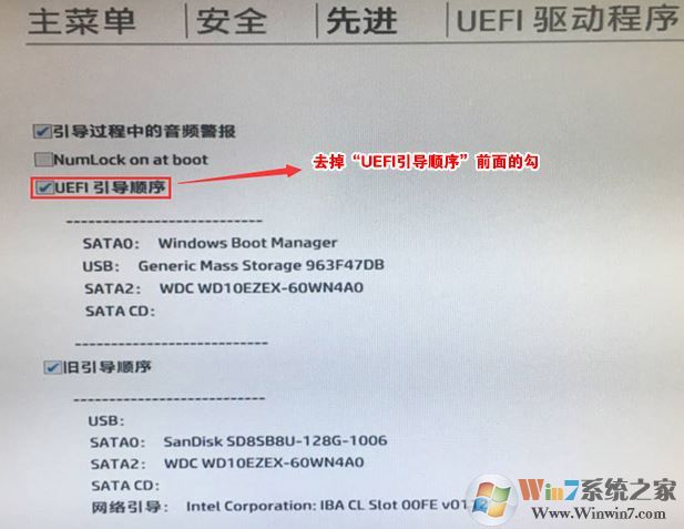6、进入后将UEFI顺序前面的勾去掉,让机器默认为传统启动,这样方便安装WIN7,如图:
