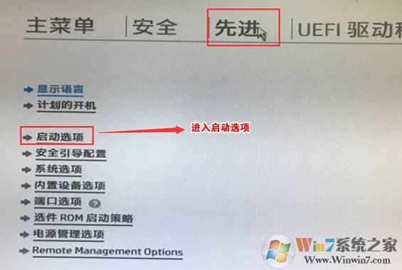 5、F10保存重启后再次开机按ESC,然后选择F10进入BIOS设置,将鼠标移动“先进”选项中,选择"启动选项"后回车进入,如图: