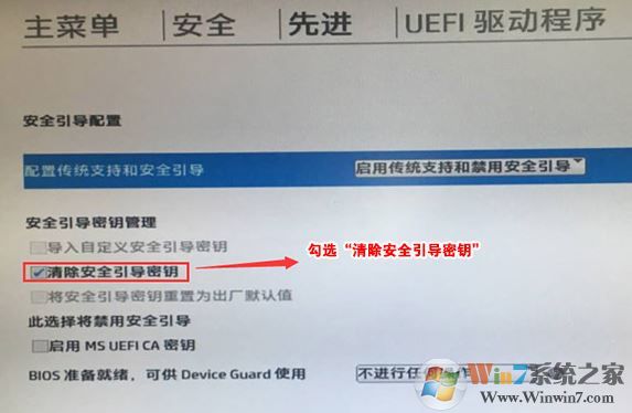 4、F10保存重启后再次开机按ESC,然后选择F10进入BIOS设置,将进入刚设置的地方,勾选“清除安全引导密钥”,然后再次F10保存;