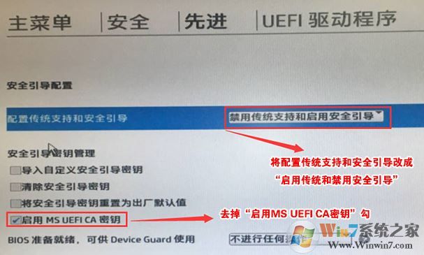 3、回车后,将配置传统支持和安全引导设置电脑“启用传统支持和禁用安全引导”以及去掉“启用MS UEFI CA密钥”前面的勾,然后按F10保存更改;