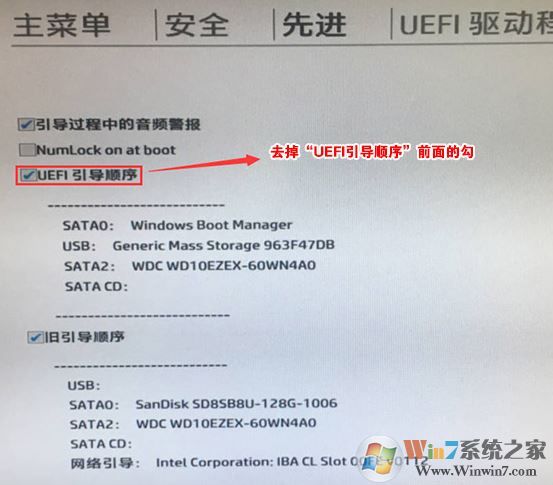 6、进入后将UEFI顺序前面的勾去掉,让机器默认为传统启动,这样方便安装WIN7,如图: