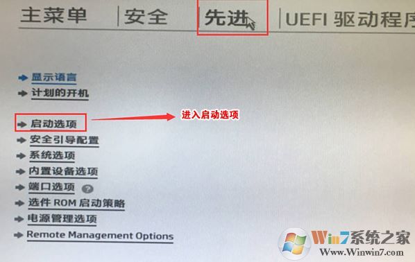 5、F10保存重启后再次开机按ESC,然后选择F10进入BIOS设置,将鼠标移动“先进”选项中,选择"启动选项"后回车进入,如图: