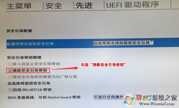 4、F10保存重启后再次开机按ESC,然后选择F10进入BIOS设置,将进入刚设置的地方,勾选“清除安全引导密钥”,然后再次F10保存;