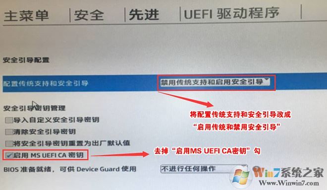 3、回车后,将配置传统支持和安全引导设置电脑“启用传统支持和禁用安全引导”以及去掉“启用MS UEFI CA密钥”前面的勾,然后按F10保存更改;