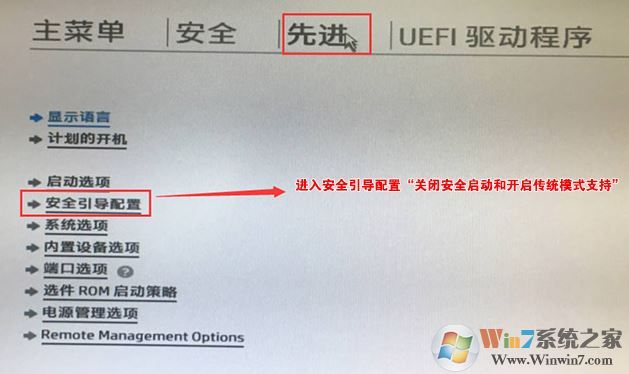 2、进入BIOS后,将移动键盘到“先进”选项下,选择"安全引导配置",按回车键进入设置;
