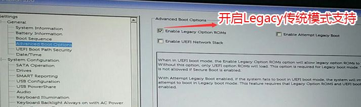 2、切换到Advanced Boot Options将右边的Enable legacy option roms选项打勾,如下图所示;