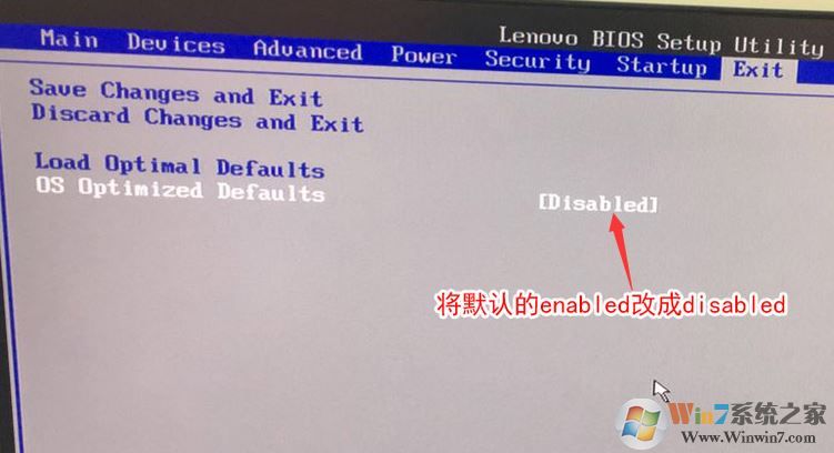 2、转到Exit,把OS Optimized Defaults设置为Disabled;