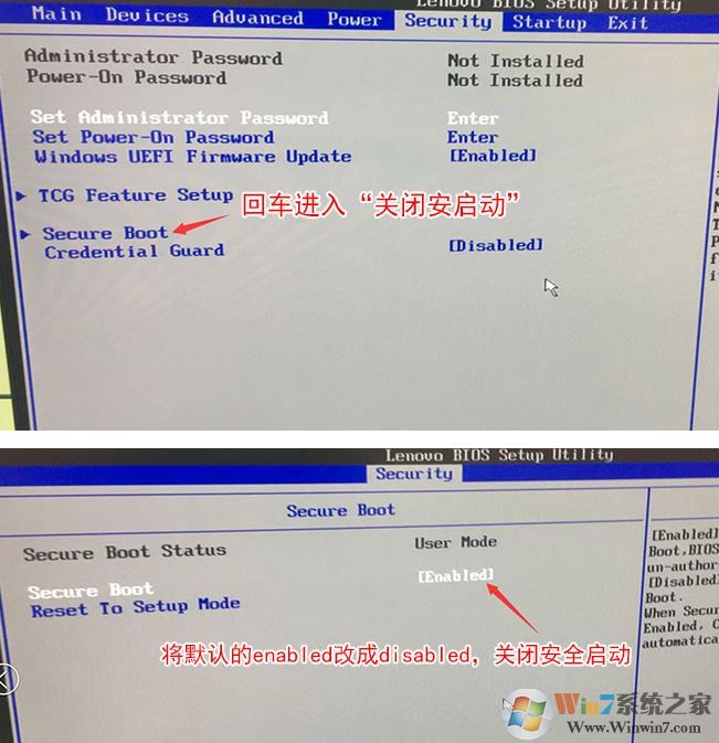 1、开机一直按F2或(FN+F2)进入BIOS,按→方向键切换到Security,选择Secure Boot回车设置成Disabled;