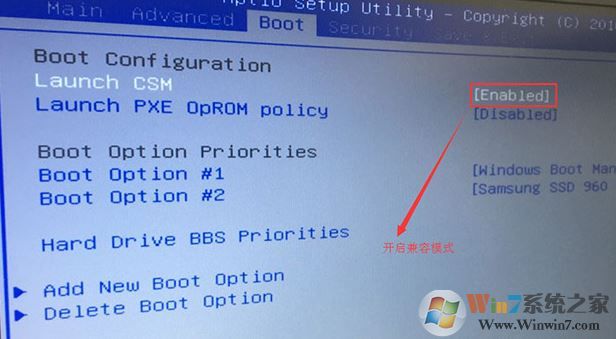2、重启后切换到BOOT的选项,把Launch CSM由disabled改成enabled,开启兼容模式;
