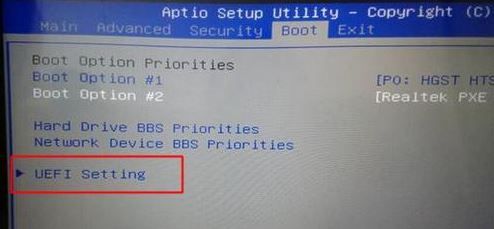 2、转到Boot界面,选择UEFI Setting回车,如图: