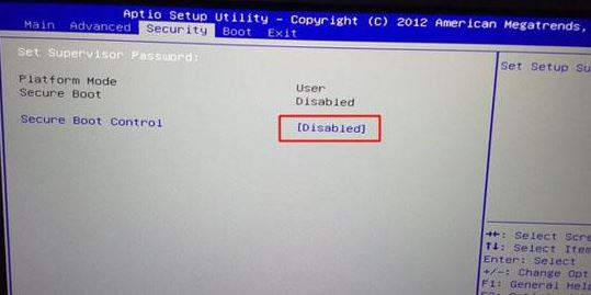 1、重启笔记本按F2进入BIOS设置,在Security下把Secure Boot Control设置为Disabled,如图: