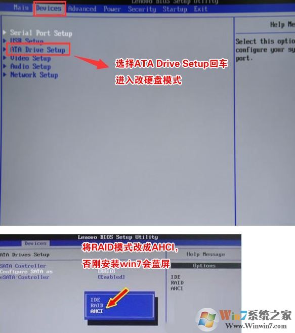 4、切将键盘移动Devices选项,把键盘移动ATA Drive Setup回车,将configure SATA as中默认的raid改成ahci模式,否则安装win7时会出现0x0000007b蓝屏,因为win7中没有集成raid硬盘驱动,然后选择F10保存设置,在弹出的选项中选择YES,如下图所示;