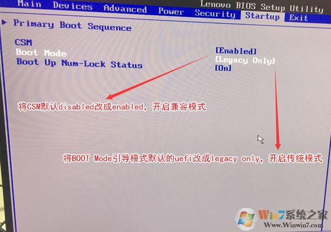 3、切换到Boot,把Boot Mode从UEFI改成Legacy only引导模式,再把csm默认disabled改成enabled,开启兼容模式,选择F10保存设置,在弹出的选项中选择YES;