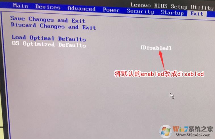 2、转到Exit,把OS Optimized Defaults设置为Disabled;
