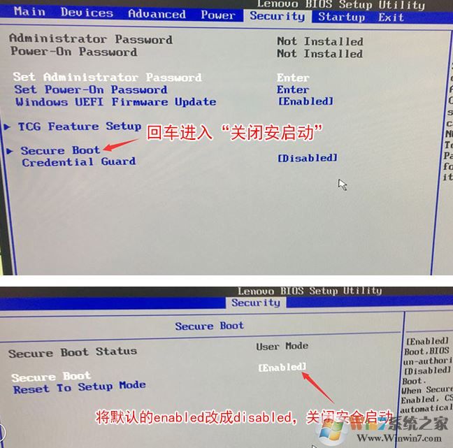 1、开机一直按F2或(FN+F2)进入BIOS,按→方向键切换到Security,选择Secure Boot回车设置成Disabled;