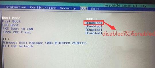 4、切换到Boot,把Fast Boot从Disabled改成Enabled,开启快速启动设置U盘启动;