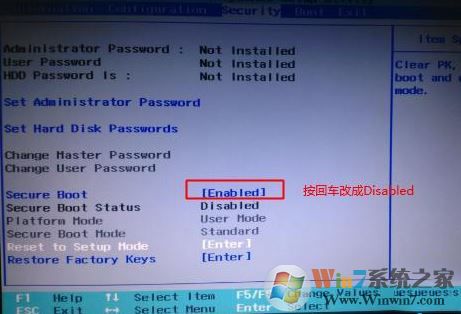 1、开机一直按F2或(FN+F2)进入BIOS,按→方向键切换到Security,选择Secure Boot回车设置成Disabled;