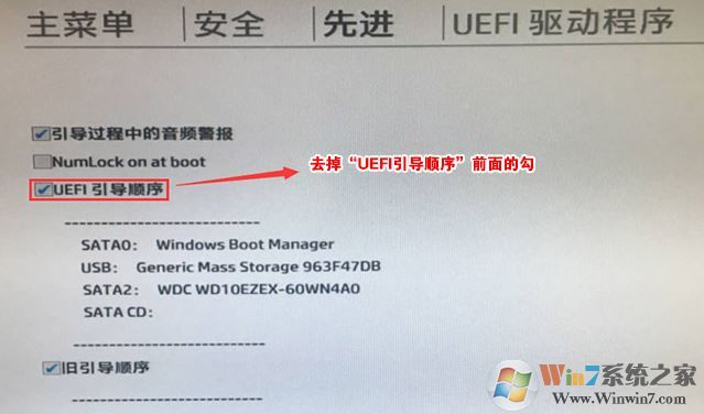 6、进入后将UEFI顺序前面的勾去掉,让机器默认为传统启动,这样方便安装WIN7,如下图所示;