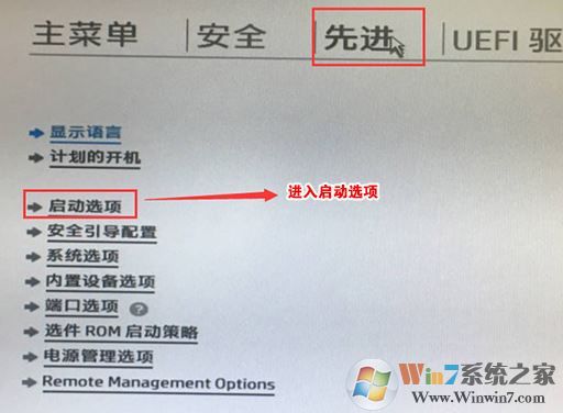 5、F10保存重启后再次开机按ESC,然后选择F10进入BIOS设置,将鼠标移动“先进”选项中,选择"启动选项"后回车进入,如下图所示;