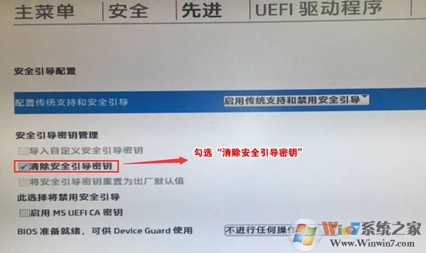 4、F10保存重启后再次开机按ESC,然后选择F10进入BIOS设置,将进入刚设置的地方,勾选“清除安全引导密钥”,然后再次F10保存;